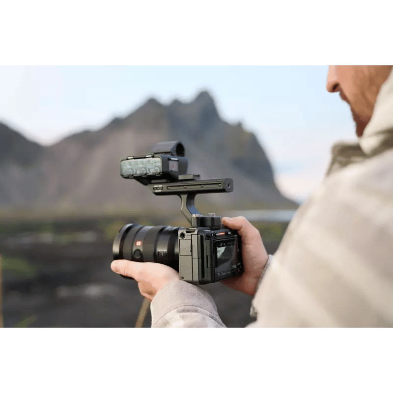 Thank you for reading this post, don't forget to subscribe!Die Kamera ist hier mit ihrem Topgriff und dem integrierten 4-Kanal-Digital-XLR-Modul abgebildet. Dieser Griff verfügt über ein Audiomodul mit zwei XLR-Eingängen und einem 3,5-mm-Mikrofoneingang. Die Kamera kann auf vier Audiokanälen aufzeichnen. Der Griff besitzt drei 1/4″-Gewindebohrungen zur Befestigung von Zubehör.